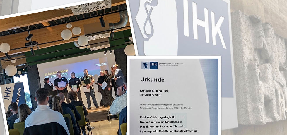 Jedes Jahr werden die besten Absolventen und Absolventinnen für ihre besonderen Leistungen in den Ausbildungsabschlussprüfungen sowie die ausbildenden Betriebe für die Qualität ihrer Ausbildungsdurchführung von der IHK geehrt. Hervorragende Leistungen verdienen besondere Anerkennung – daher wurden vier in 2024/2025 besonders erfolgreiche Abschlussprüfungsteilnehmer/innen und auch das Bildungsunternehmen Konzept Bildung und Services GmbH selbst von der Bergischen IHK in einem festlichen Rahmen im Remscheider Grillardor am 25.09.2025 ausgezeichnet.Das gesamte Team bei Konzept Bildung ist besonders stolz auf die erfolgreichen Absolventinnen und Absolventen der Umschulungen in den Berufsbereichen Fachkraft für Lagerlogistik, Kaufmann/-frau im Einzelhandel sowie Maschinen- und Anlagenführer/in. Allen Umschüler/innen gelten besondere Anerkennung und herzliche Glückwünsche Das Konzept Bildung Team ist zugleich dankbar, alle Absolventen und Absolventinnen auf dem Weg zu ihren beruflichen Zielen begleitet zu haben.